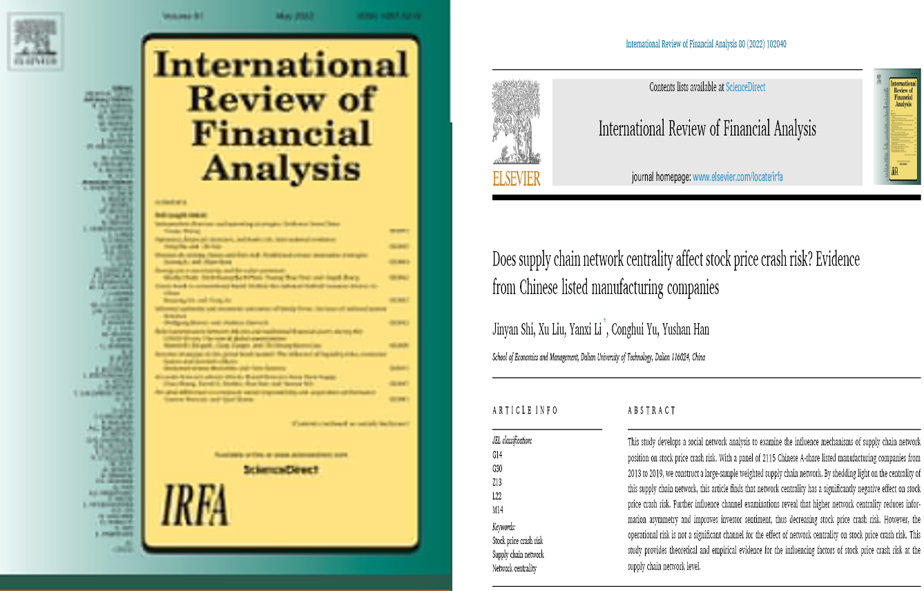 2022年3月,以经济管理学院金融与会计研究所、开放金融中心团队史金艳教授为第一作者的论文”Does supply chain network centrality affect stock price crash risk? Evidence from Chinese listed manufacturing companies” 在金融学领域国际高水平期刊《International Review of Financial Analysis》发表,是该研究团队2022年度在经济管理学院认定的TOP10期刊发表的第二篇学术论文。