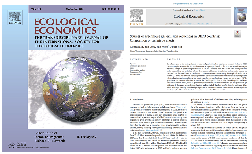 孙晓华教授为第一作者、王昀副教授为通讯作者的论文“Sources of greenhouse gas emission reductions in OECD countries: Composition or technique effects”(温室气体减排是来自结构效应还是技术效应?)发表于国际知名学术期刊Ecological Economics,共同指导的博士生董艳、任俊林分别为第二和第四作者。Ecological Economics生态经济学是JCR-1区、AJG三星、学院TOP 10期刊,在Economics学科类别的376种期刊中排名第27,在Environmental Studies学科类别的125种期刊中排名第24,2020年的影响因子是5.389(五年影响因子为6.233)。